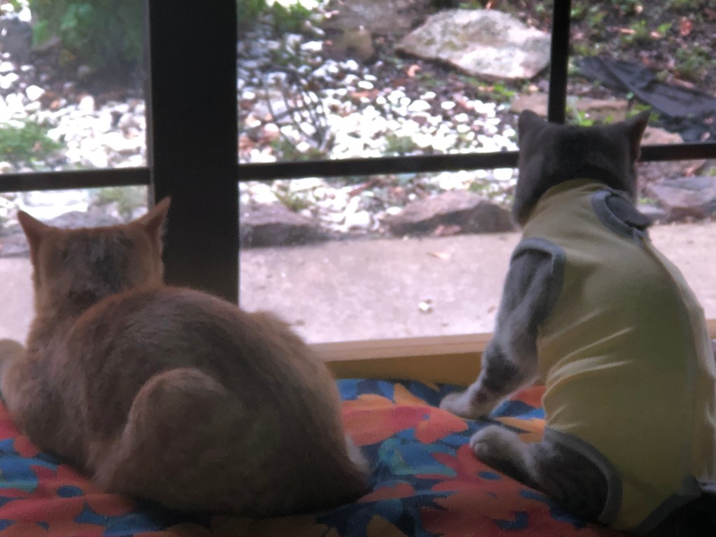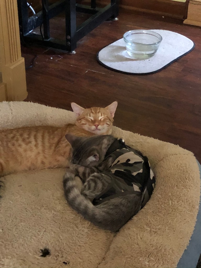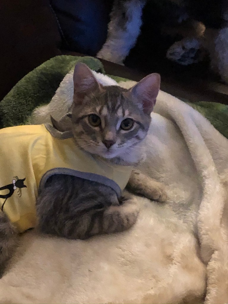 I am afraid Tina will be cold once she gets her stitches out and we remove the onesie. AND YES I love the cat clothing it makes me smile every