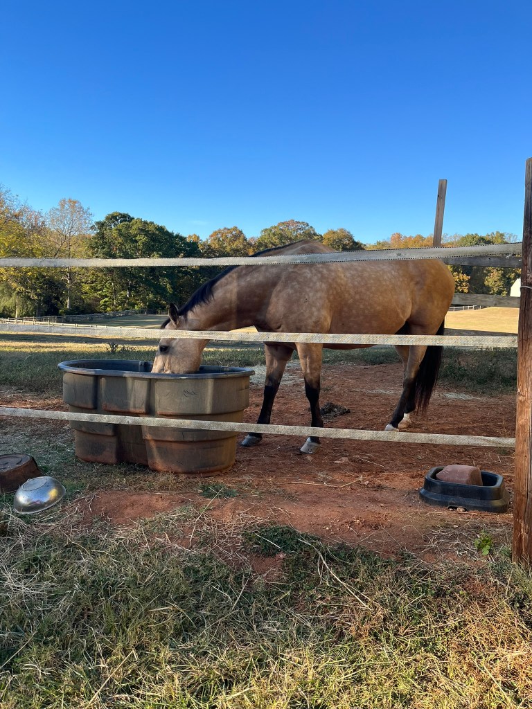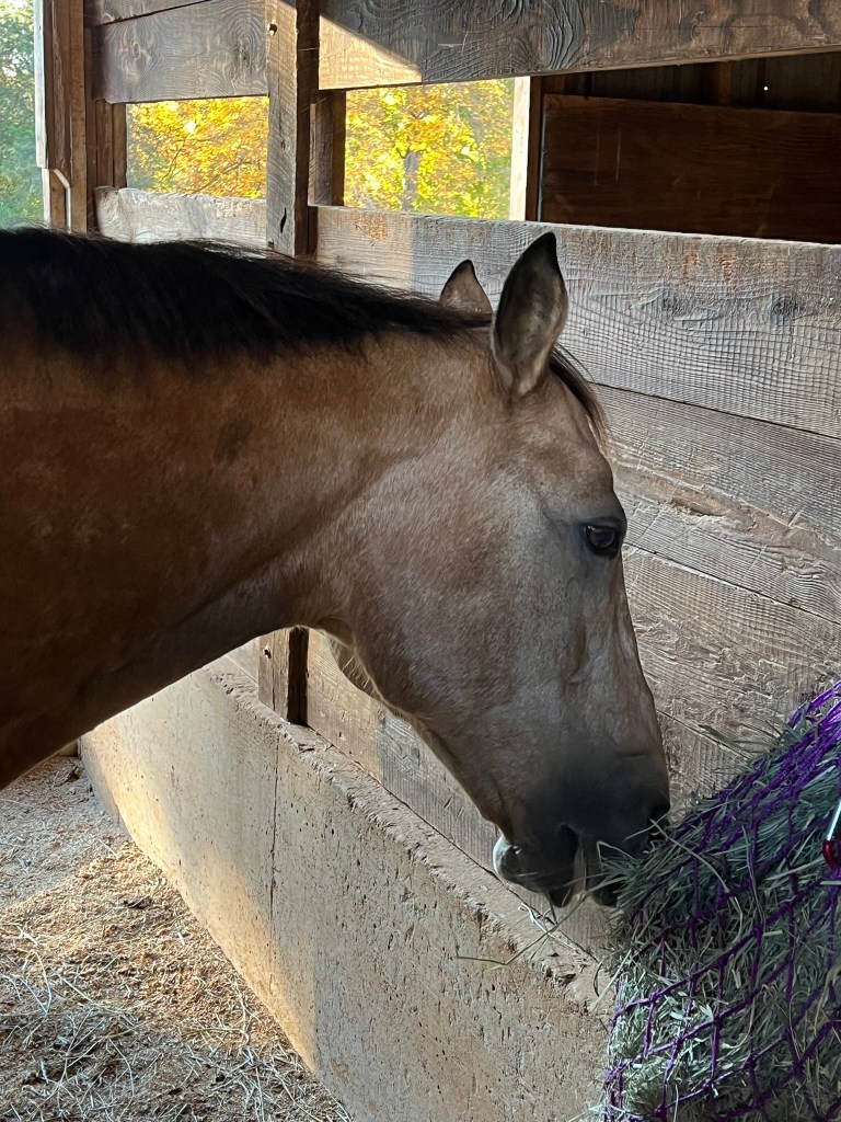His dapples are on point this Fall and he seems very chill and not worried at all in the new place. He has his own field but horses are on all sides of him and he is eating like a champ (DUH) and just goes in and out as he wants. He seems to be enjoying all the turn out though SUMMER has returned for some reason after Frost earlier this week and it is going to be high 80s the next few days.