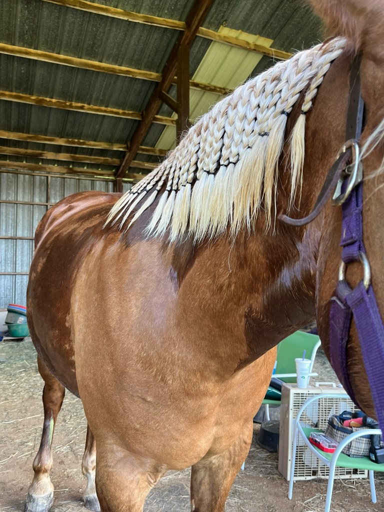 Quick drive by post to say Finn has started sweating again (Thank goodness). We also gave him a medicated bath today and braided his HUGE mane down again. Trying to get it to lay on one side and hopefully pull it soon. It is a mess (as is he!).