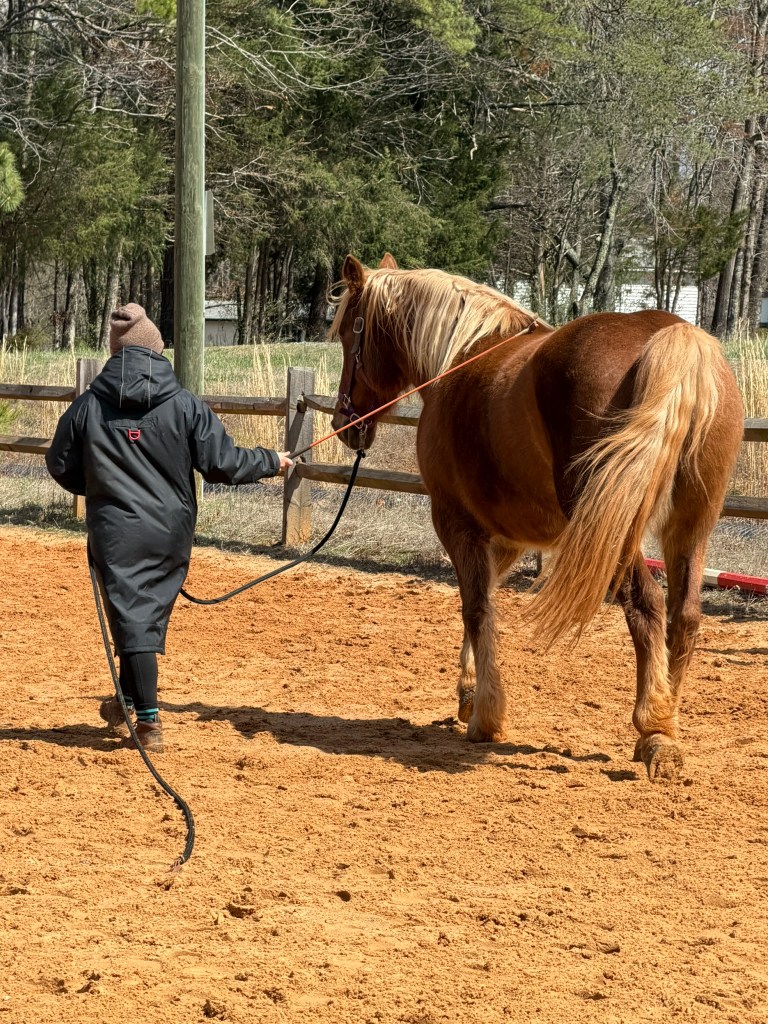 Since the temps had dropped 40 degrees AND it was windy as F we decided to do a ground work lesson with him. Which was fine with me I was freezing and would have agreed to anything (except me climbing aboard) HA!